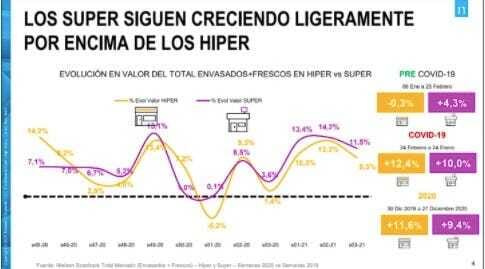 Una interesante gráfica de Nielsen para reflexionar. Volvemos a tener un comportamiento similar al del confinamiento. El consumidor vuelve a estar alerta por los datos de la tercera ola y sube el Gran consumo, la única diferencia respecto al año anterior es el canal que ha elegido para abastecerse. Se abandona el gran almacenaje con efecto en el Híper que tiene cifras inferiores al Súper.
