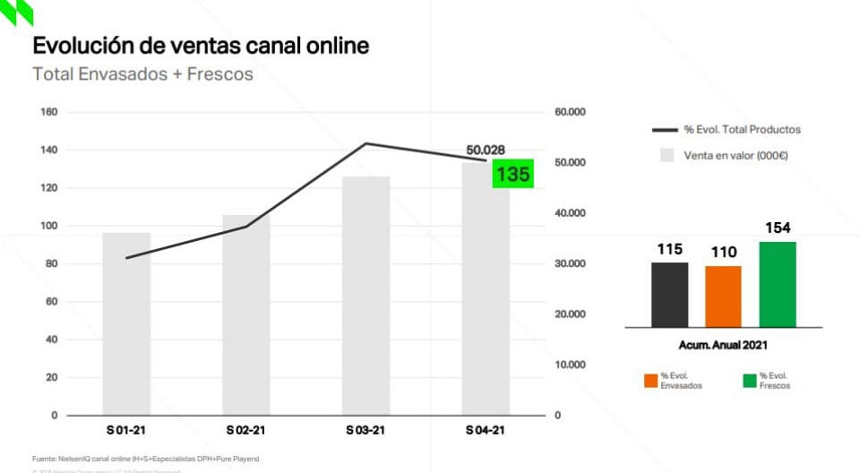 La venta online no para, NielsenIQ anuncia que durante Enero 2021 se ha duplicado el mercado del eCommerce de alimentación y se mantiene el triple dígito, en la última semana se alcanzó el 135% de crecimiento.