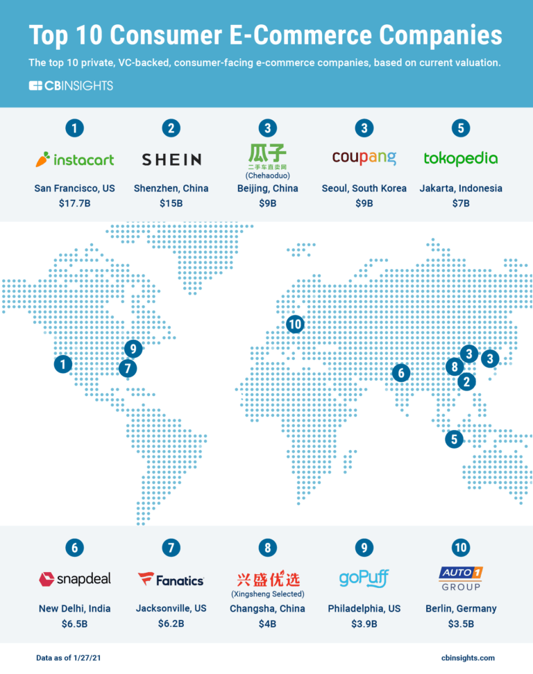 Los diez eCommerce privados más valiosos a nivel global. La pandemia ha disparado el uso de las plataformas de venta online. En el segundo semestre de 2020, la financiación del eCommerce ha crecido un 63% y el número de unicornios se ha incrementado.