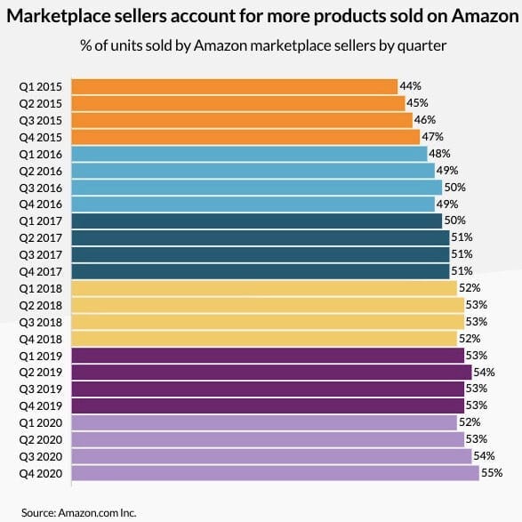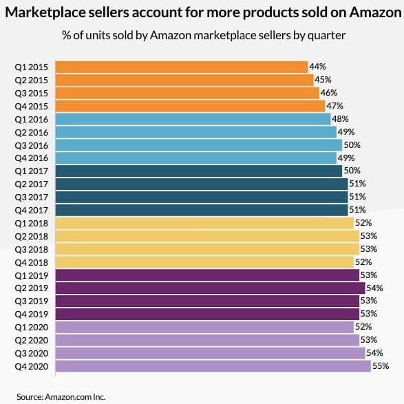 Interesante gráfica con el porcentaje de productos que en Amazon venden los marketplace sellers. En el Q4 de 2020, se situaba en el 55%, un incremento del 53% en 2019 y del 47% en 2015.