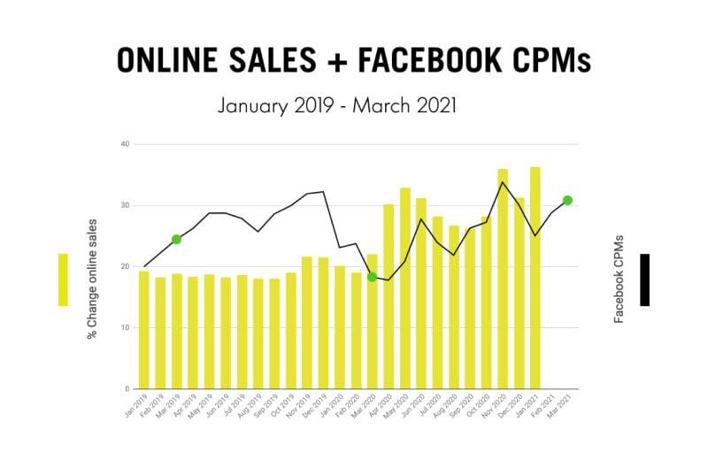 Si pensabas como yo que Facebook esta muerto, parece que no es así, el coste de FacebookAds se encuentra en máximos históricos. Los CPMs de Facebook de marzo crecen un 69% por encima que en 2020 y un 26% más que en 2019. Con un incremento de ventas online rompiendo récords mes tras mes, existe una gran competencia entre compañías por publicarse en la red social.