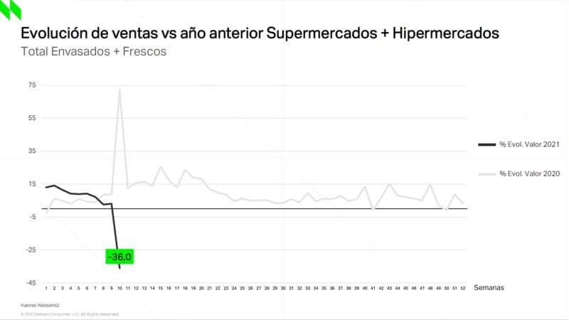 Ahora toca enfrentarnos a esa nueva normalidad, de la que se nos hablaba desde el comienzo de la pandemia, el gráfico de Nielsen de la evolución de ventas de Supermercados e Hipermercados es una buen ejemplo.