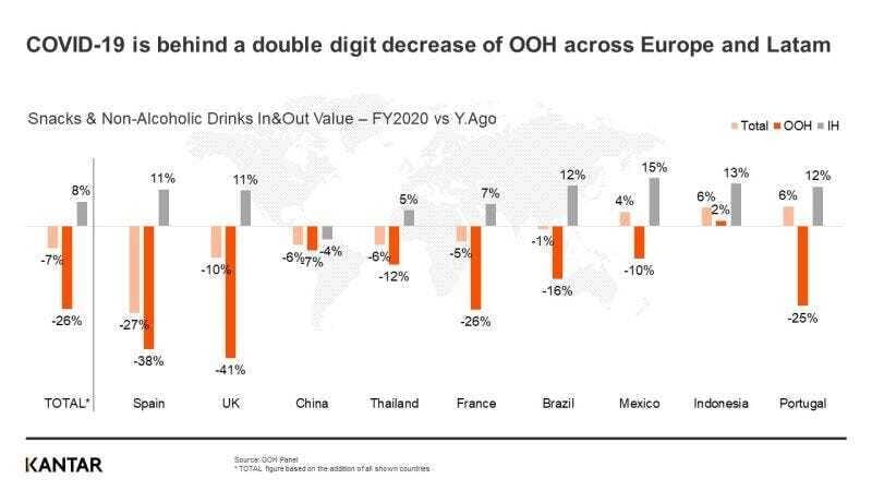 Comenzamos a consumir mas en el hogar. En el sector de aperitivos y bebidas no alcohólicas las ventas combinadas son negativas, lastradas por las restricciones en la hostelería. El panel de Kantar muestra cómo el consumo fuera del hogar (OOH) cae 22.000 millones de dólares, un 26%, mientras que las ventas en el hogar se incrementan 8.000 millones de dólares, un 8%.