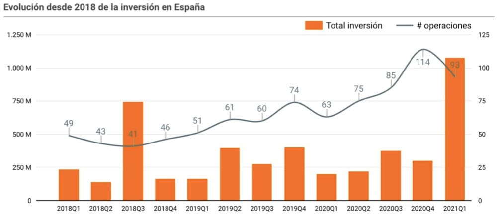 Un total de 93 operaciones el Q1 2021 que arrojan una inversión de 1.080 millones de euros, un crecimiento del 47,6%, volumen similar al de todo el 2020. Cifra alcanzada gracias a las megarrondas de Idealista, Wallapop y Job and Talent.
