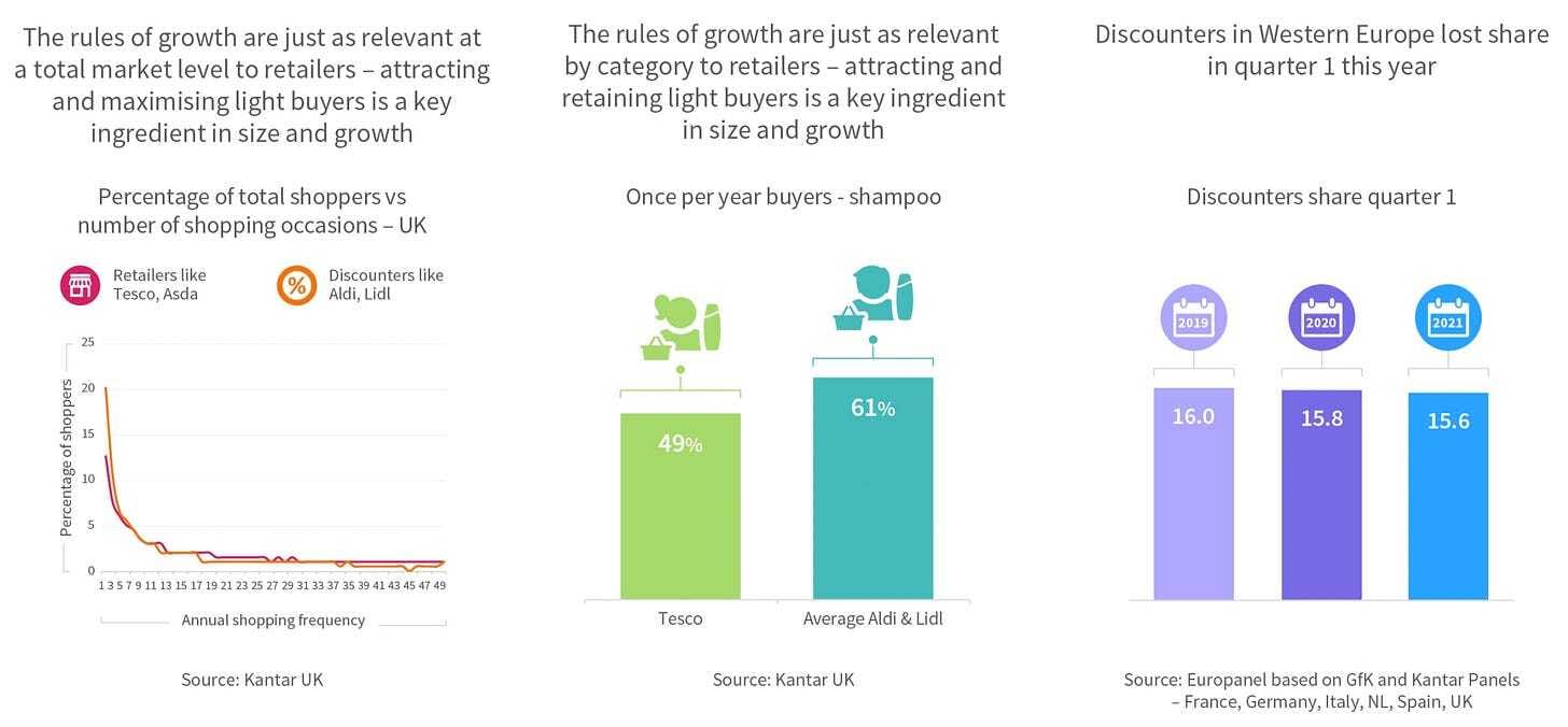 Por categoría dentro de un retailer cobran mas importancia. Por ejemplo, en Tesco, el 50% de los compradores solo compran una vez al año, en Aldi & Lidl el 60%