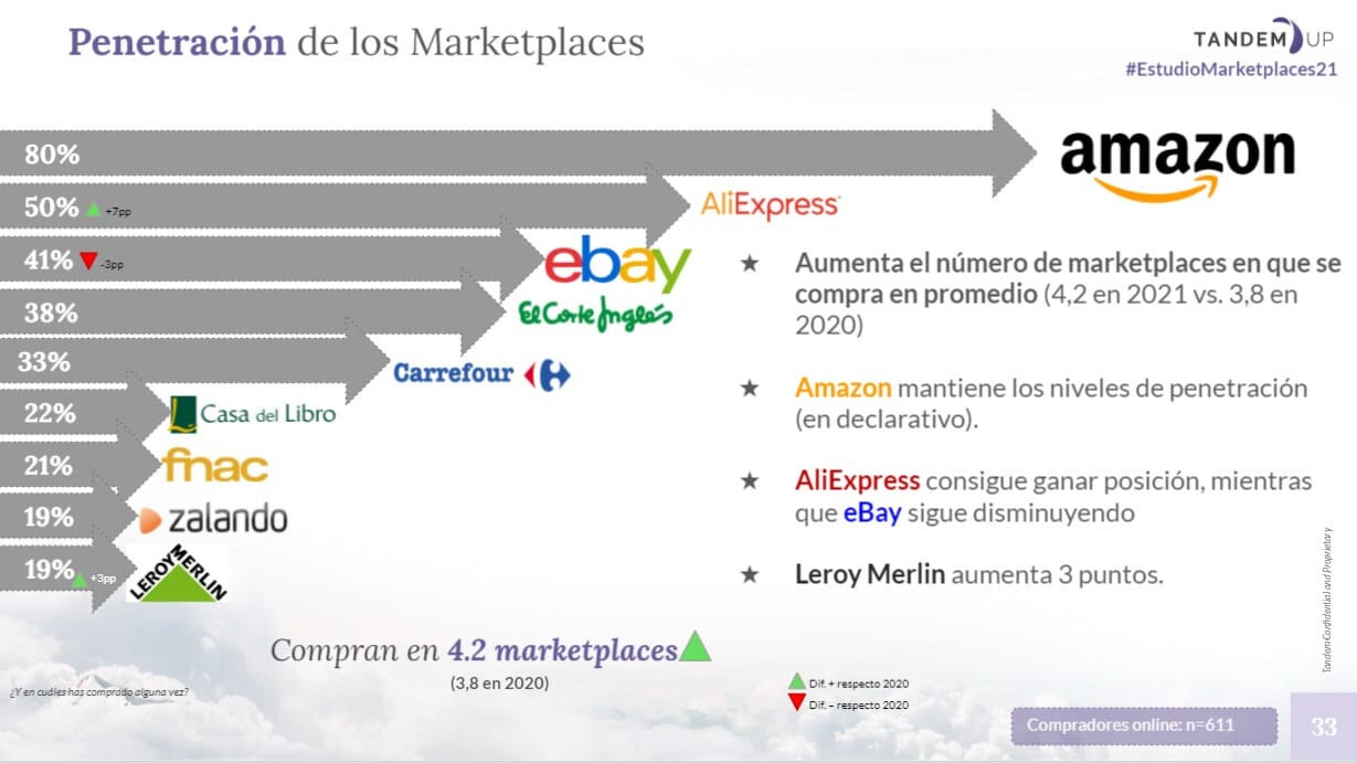 Dos datos a destacar del Estudio Anual Marketplaces 2021 España de Tandem Up. Amazon líder absoluto del online en España, más del 90% de los consumidores digitales ya compra en Amazon y dentro del sector de alimentación, Carrefour destrona a El Corte Inglés en el online.