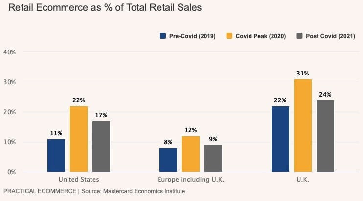 Un vistazo al mercado online de de U.K. se espera que cierren el año con un crecimiento del 9%, con una participación del 30,2%, en el 2020 el crecimiento fue de un 46,5% . Los datos mas preocupantes son los del 2022 donde se estima tan solo un 0,1% y la participación será del 28,1%, el retail físico recuperará parte de ese mercado que perdió en la pandemia.