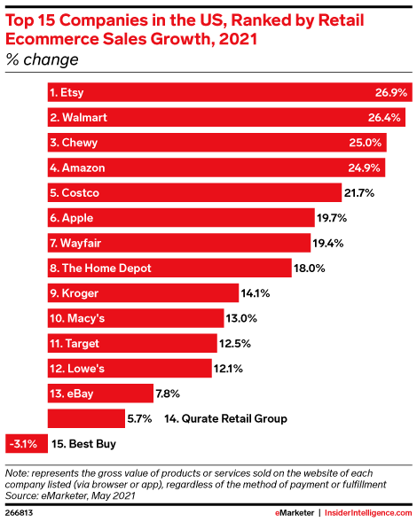 El Top 15 de los eCommerce de EE.UU por crecimiento de ventas en 2021. Estas quince empresas representarán el 72,3% de las ventas de eCommerce en EE.UU este año, 10,5 puntos porcentuales más que en 2019. Etsy se posiciona como líder con un aumento del 27% de sus ventas seguido de Walmart. Amazon, a pesar de su 25%, no se coloca en el Top3.