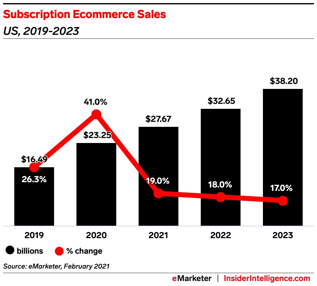 El otro modelo de venta en auge, es el eCommerce es el de suscripción. Las ventas de comercio electrónico por suscripción despegaron en medio de la crisis, con un crecimiento del 41%. Se pronostica que el 3% de las ventas de comercio electrónico minorista en EE.UU. provendrá de suscripciones en 2021, por un total de $ 27.67 mil millones.
