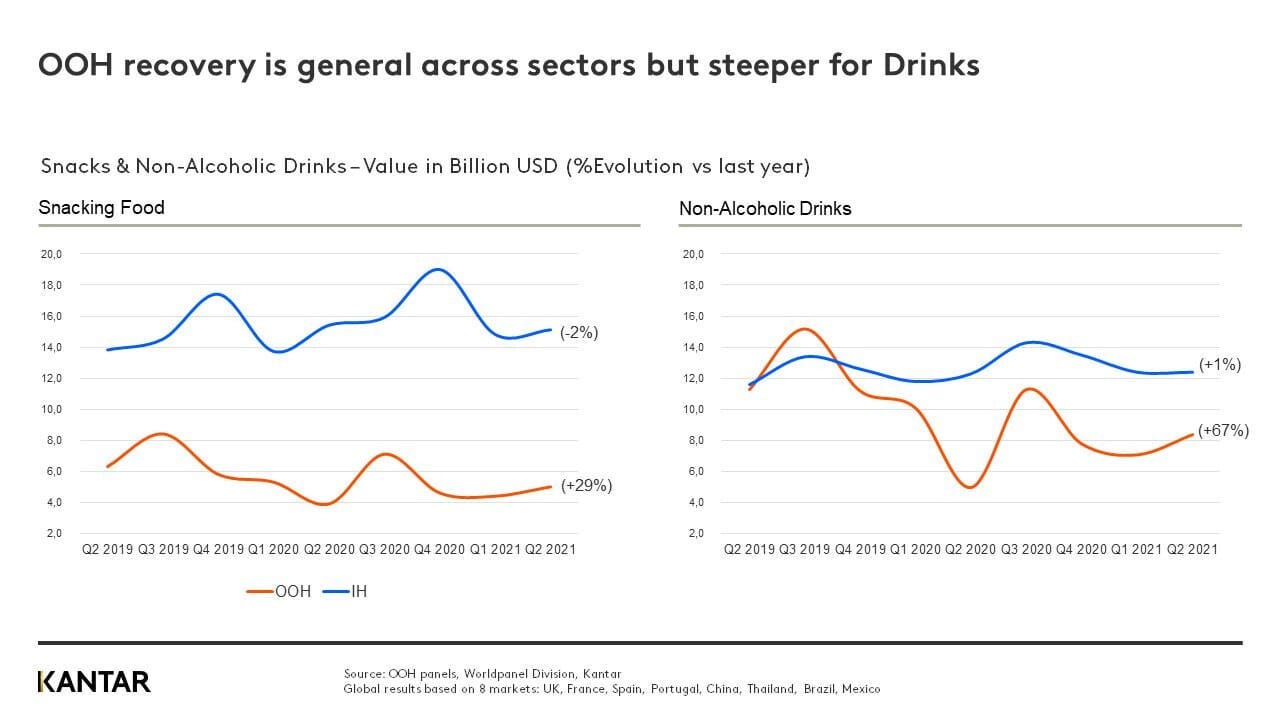 Y desde Kantar una visión del canal OOH. Las ventas totales de bebidas no alcohólicas, por valor, aumentaron un 67% interanual para el consumo fuera del hogar, en comparación con un aumento del 1% para el consumo en el hogar. Los bocadillos han sido más resistentes durante los confinamientos, pero aún aumentaron un 29% para OOH, con una ligera caída en los bocadillos en el hogar (-2%).