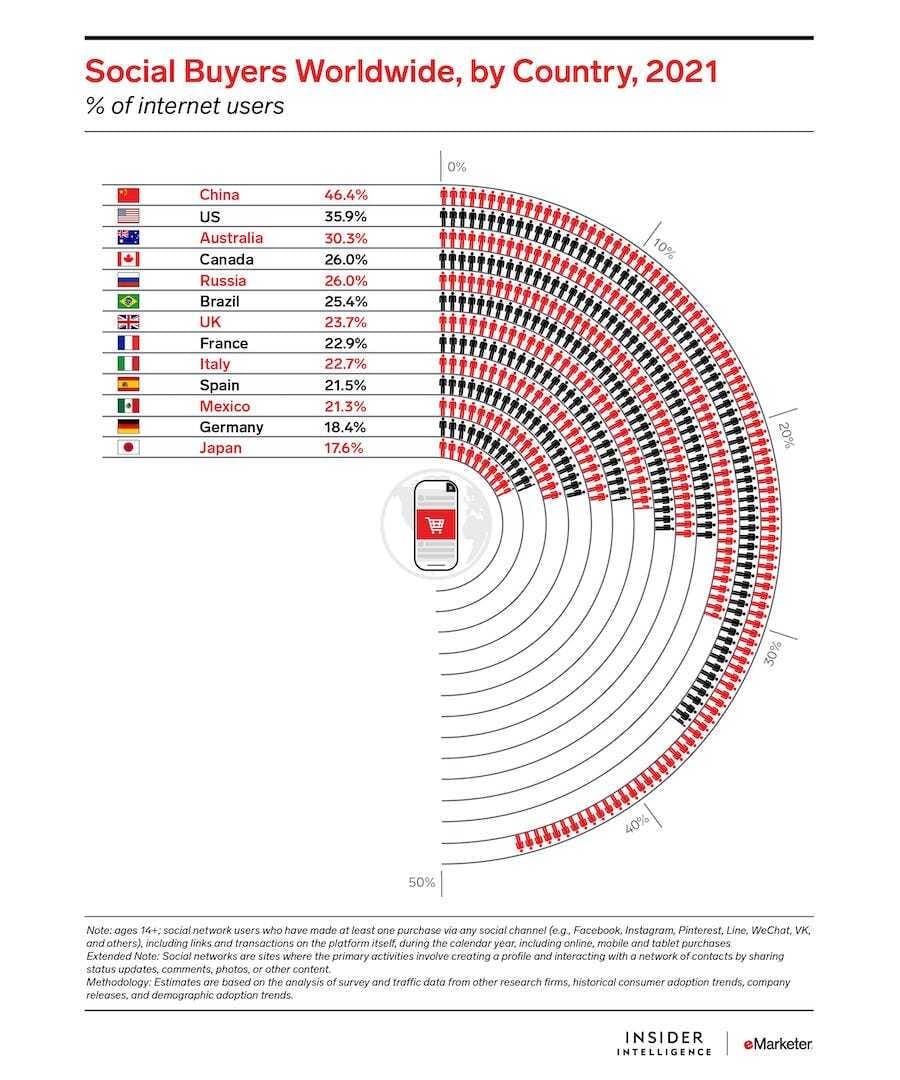 En 2021, se espera que 90,2 millones de habitantes, el 35,9% de los usuarios de Internet, realicen al menos una compra de Social Commerce.