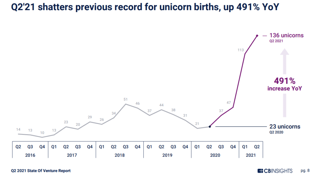 Los unicornios están viendo despegar sus valoraciones. En el Q2 2021, 136 nuevos unicornios nacieron en todo el mundo. 2021 vio nacimientos de unicornios a niveles de valoración récord, aumentando de un promedio de 1,18 mil millones de dólares en 2016 a 1,56 mil millones de dólares en lo que va de año.