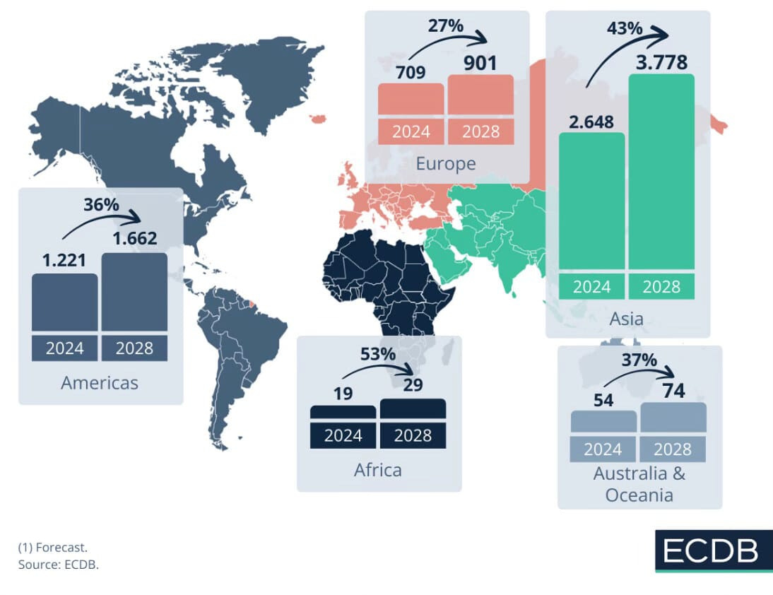Asia domina el comercio electrónico con el 56.9% de los ingresos globales y $2.6 billones generados en 2024, proyectando un crecimiento anual del 42.7% hasta alcanzar los $3.8 billones en 2028. China, con $2 billones en ingresos, lidera la región gracias a empresas como Alibaba y JDcom, que impulsan la innovación y expansión del mercado.