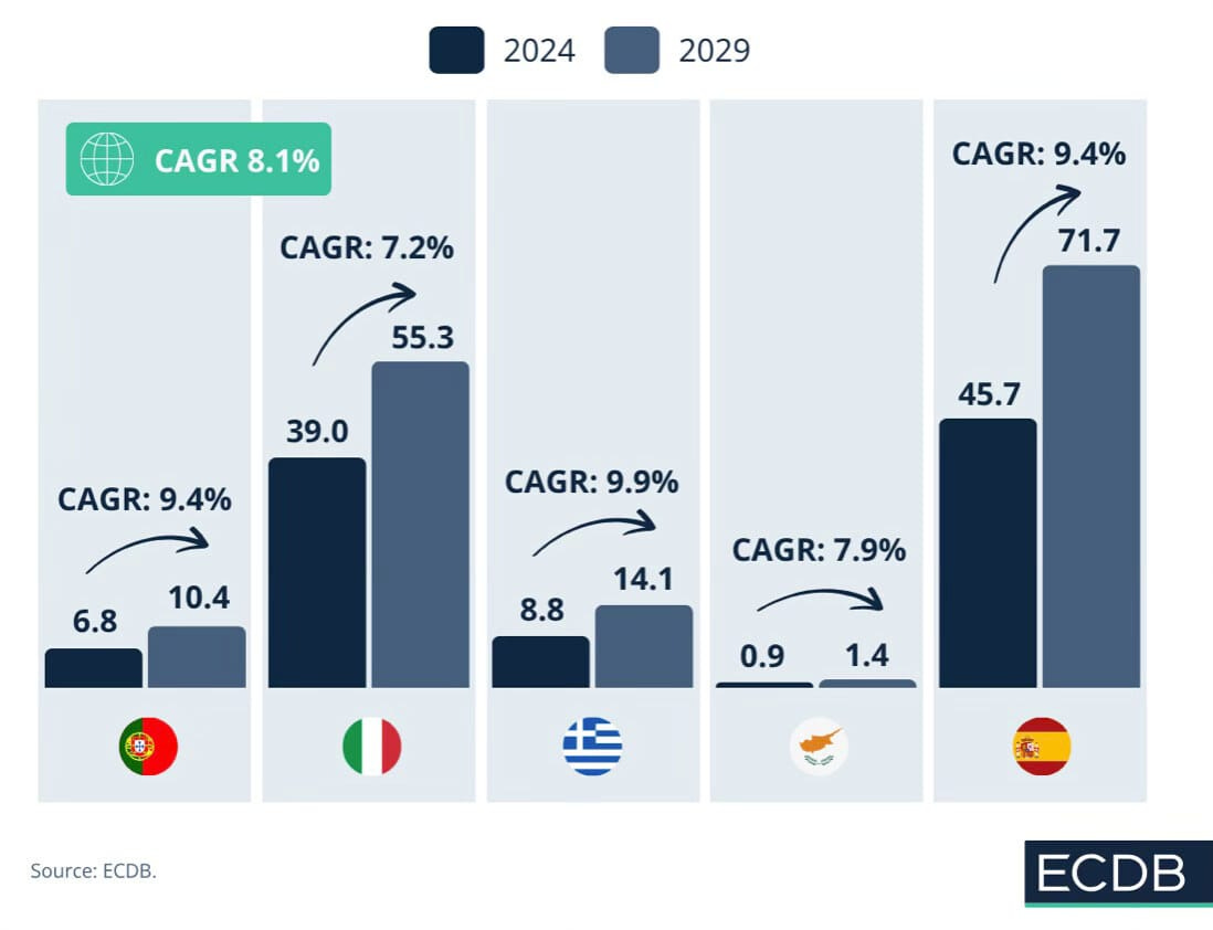 CAGRs por encima del promedio mundial: Grecia lidera con 9,9%, seguida de España y Portugal con 9,4%, todas por encima del 8,1% global entre 2024 y 2029.