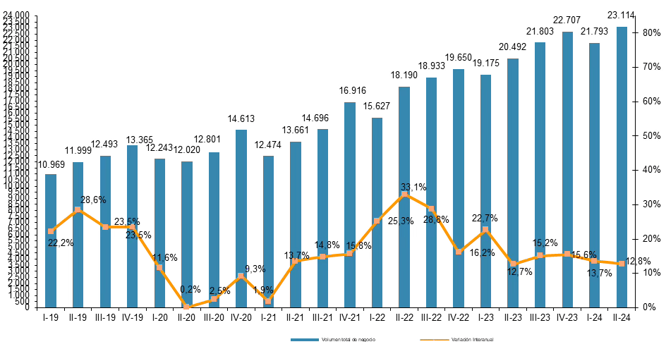 📉 En el segundo trimestre de 2024, el comercio electrónico en España alcanzó una facturación de 23.114 millones de euros, lo que representa un crecimiento del 12,8 % interanual, según datos de la CNMC.