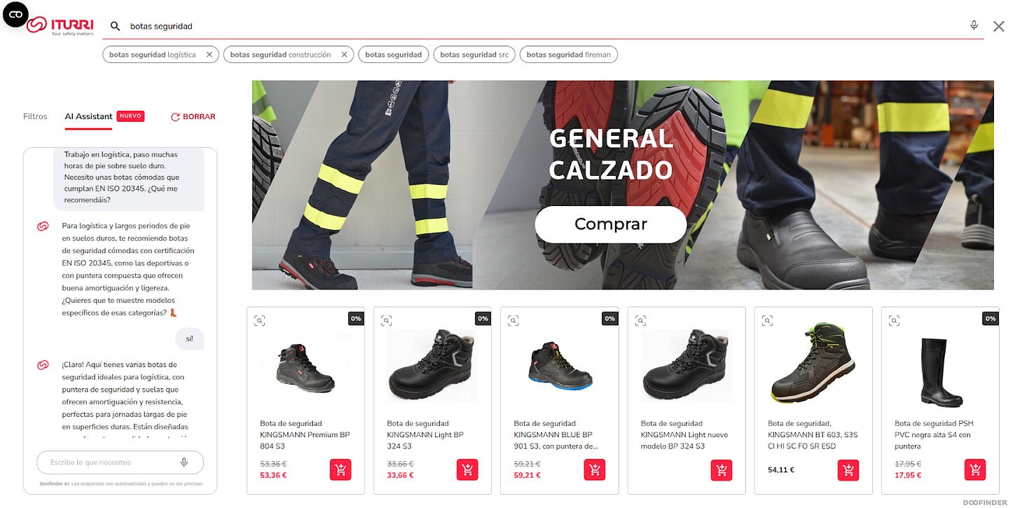 El AI Assistant de Doofinder está configurado con conocimiento específico: normativas, materiales y condiciones de uso. Entiende la consulta técnica, propone el producto adecuado y resuelve dudas sin salir de la ficha.