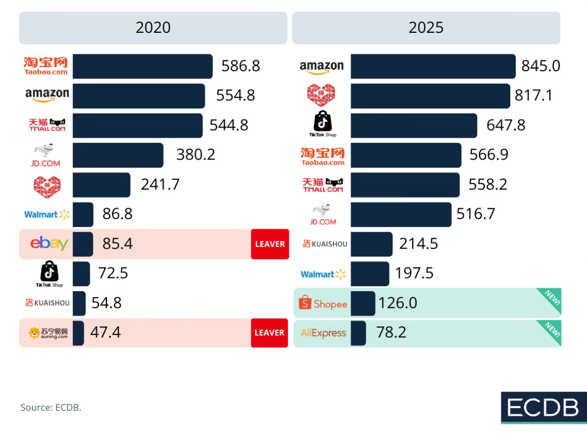 El top 10 gira hacia Asia: el 80% de los players son del Este; entran Shopee y AliExpress y salen eBay y Suning.