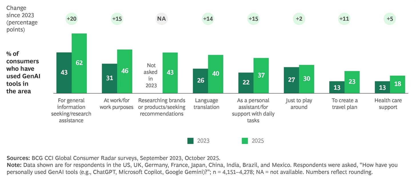 La adopción es ya masiva, el 66% de los usuarios de la GenAI la utiliza al menos semanalmente, y en algunos países el 50% de los consumidores ya la usa.