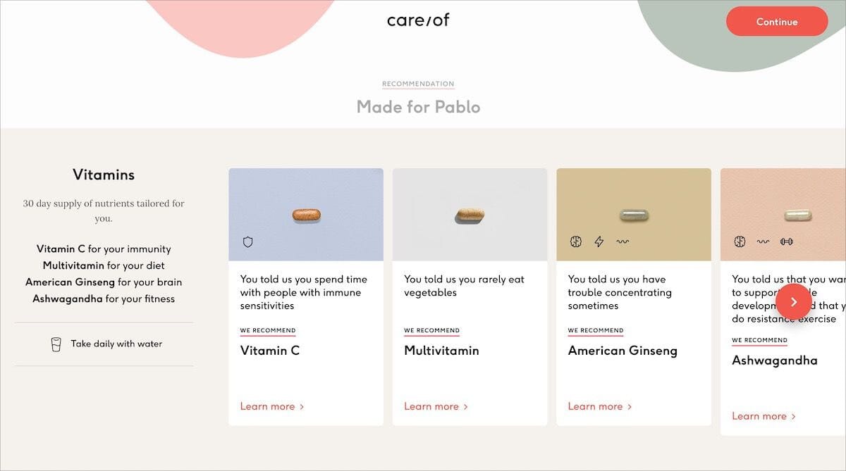Creo que los amigos de Care/of han entendido muy bien cómo diferenciarse a través de la hiper-personalización. Han construido un maravilloso proyecto que es relevante, transparente, honesto y donde el usuario está en el centro.
