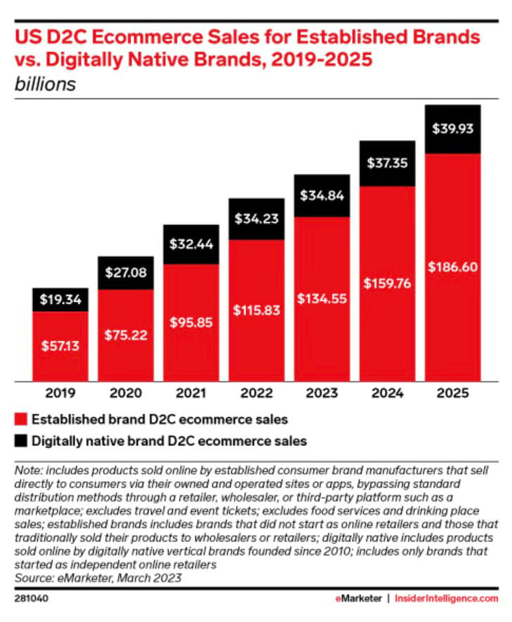 Se pronostica que las ventas de eCommerce D2C de las marcas (en los EE. UU.) crecerán en dos dígitos hasta el final de 2025, mientras que las DNVB crecerán solo un 1,8 % este año y un solo dígito hasta 2025.