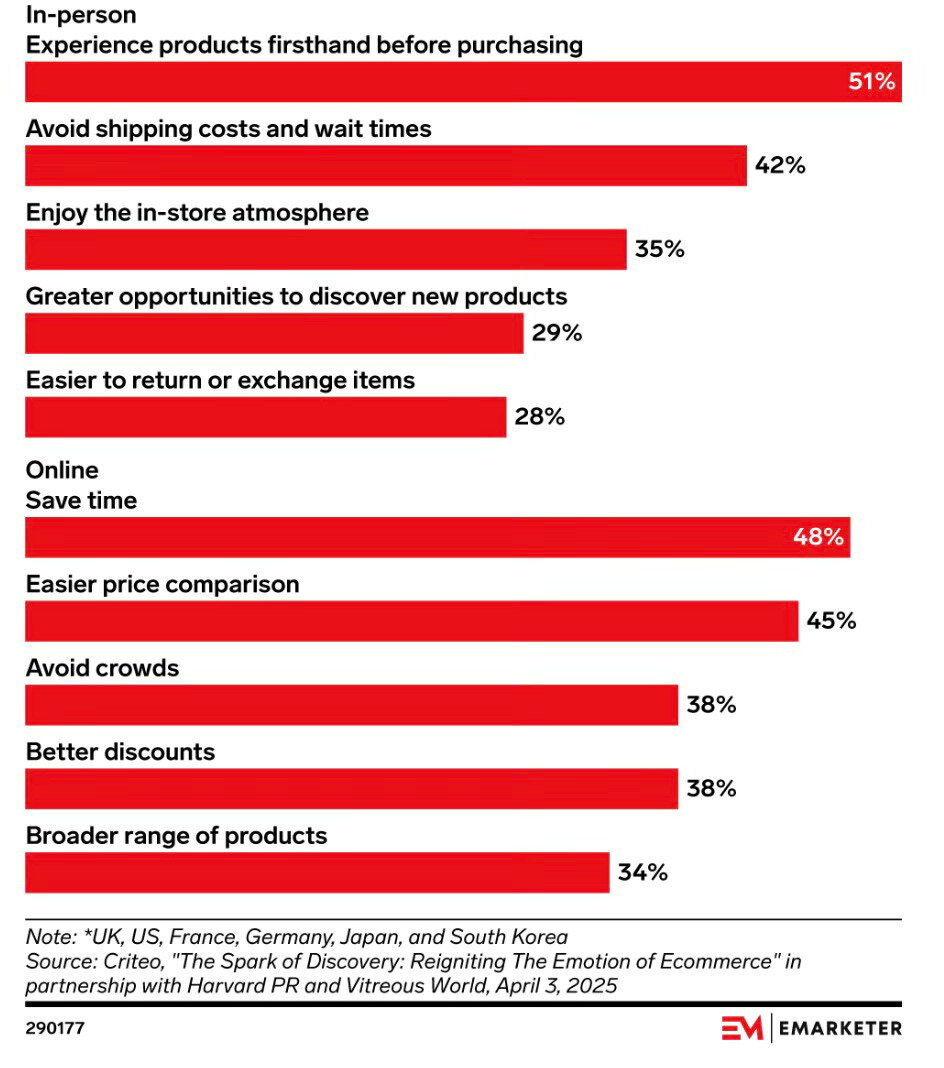 🎯 La experiencia física sigue siendo clave: el 51% de los consumidores globales prefiere comprar en tienda para ver y probar productos antes de decidir.