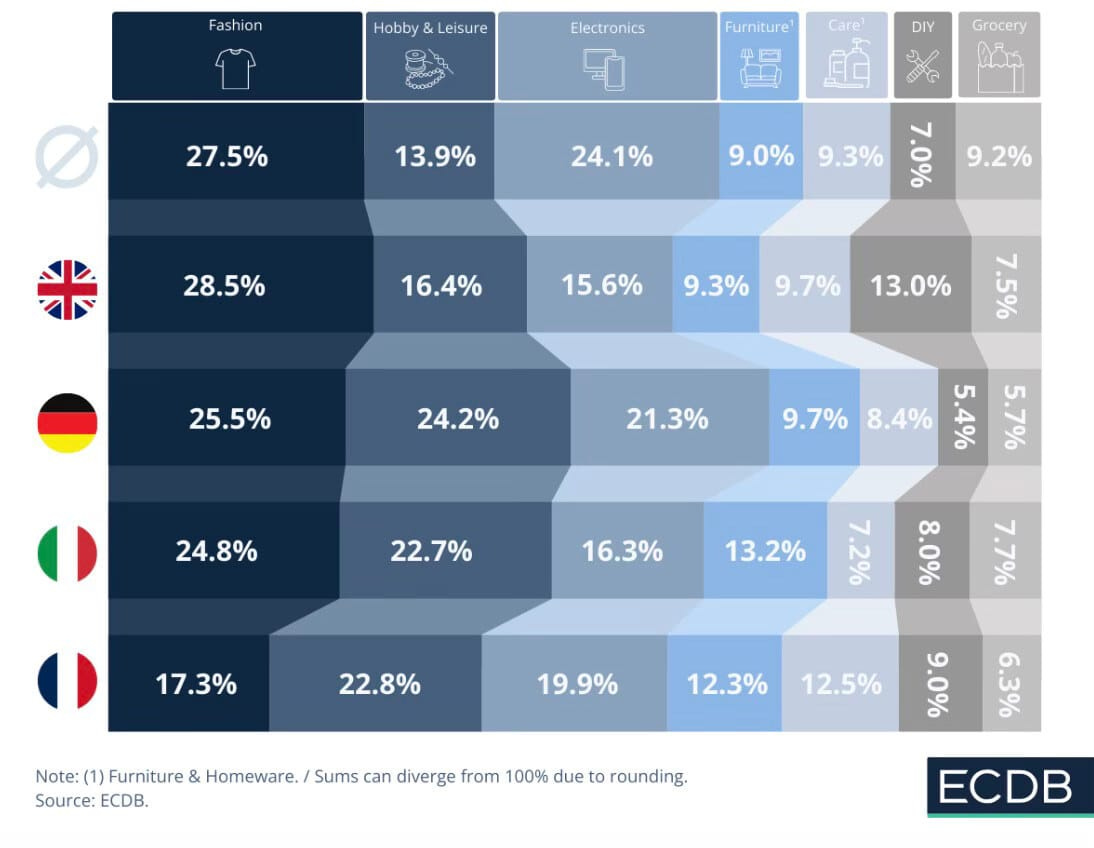Moda domina el eCommerce: En Reino Unido, Alemania e Italia, la moda lidera ingresos online con 28,5%, 25,5% y 24,8% respectivamente, superando el promedio global.