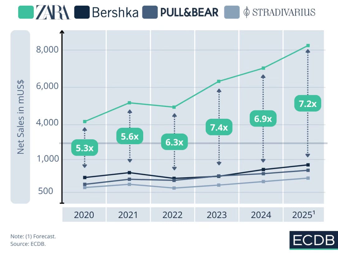 Stradivarius también acelera: prevé cerrar 2025 con US$815 millones, tras crecer más de 200 millones desde 2023.