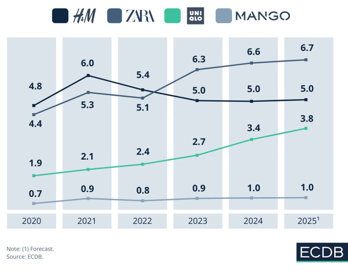 Zara lidera con crecimiento constante: superó a H&M en 2023 y alcanzará US$6.700 millones en ventas online en 2025, consolidando su liderazgo.