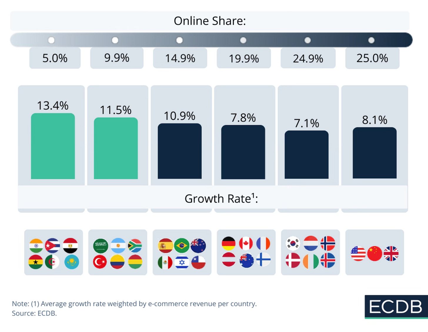Los mercados con penetración online por debajo del 10% concentran el mayor crecimiento, con picos del 13,4%, frente al 8% en mercados maduros, confirmando que menor adopción implica más recorrido para el eCommerce.