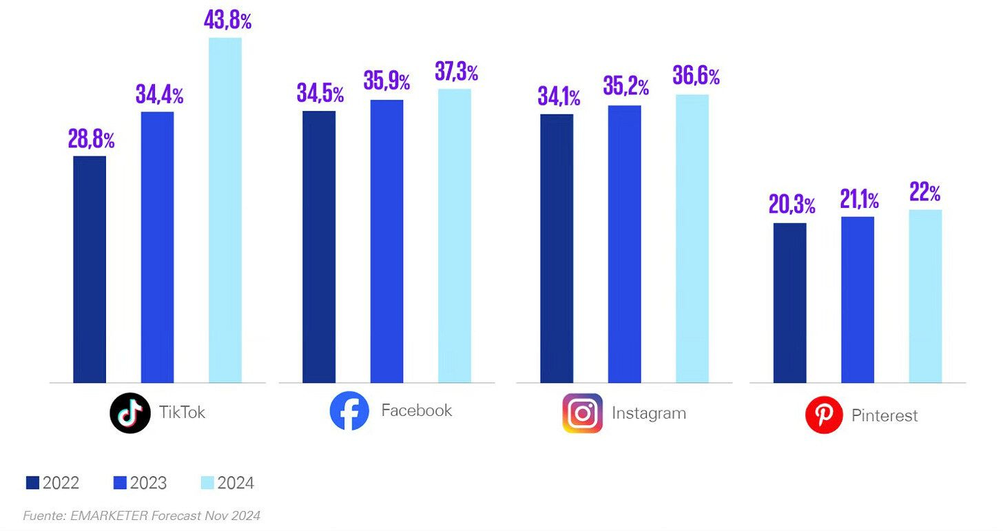 Crecimiento del Social Commerce y su penetración global: En 2023, el 44% de consumidores globales compró por redes sociales. El canal ya representa el 19% del eCommerce mundial, frente al 5% en 2018.