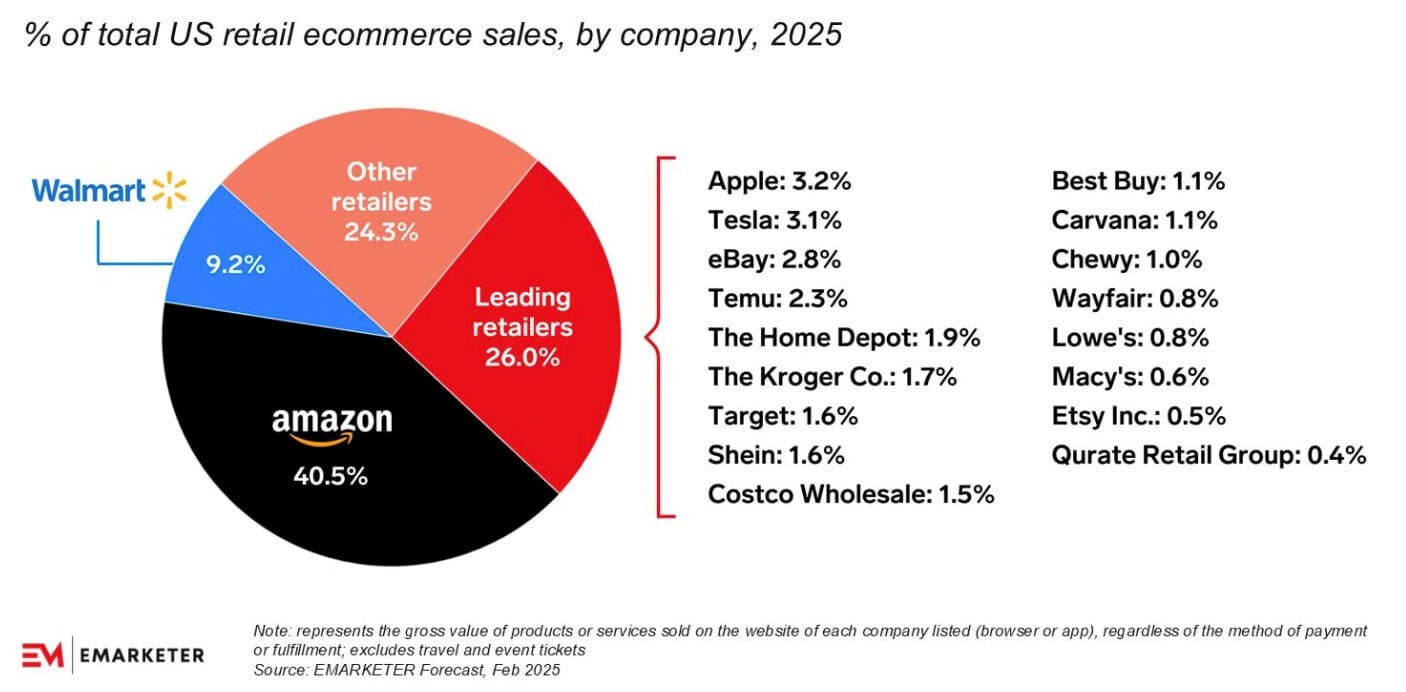 Un largo "long tail" de competidores: Fuera de Amazon y Walmart, no hay un retailer claramente dominante. La mayoría de las ventas online provienen de muchos actores pequeños y medianos.