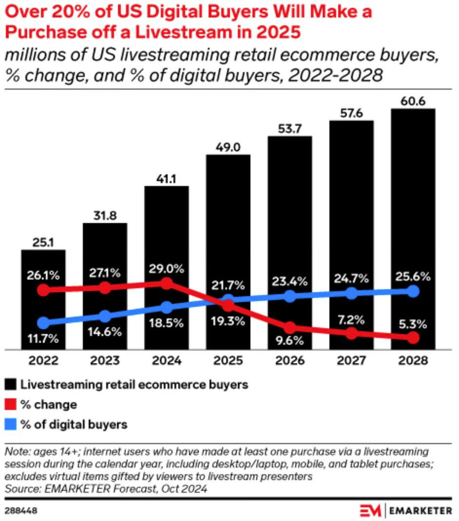 🎥 El auge del livestream shopping en EE.UU. El canal sigue ganando terreno, con más consumidores adoptando esta tendencia para compras digitales, especialmente en bienes de lujo y experiencias interactivas.