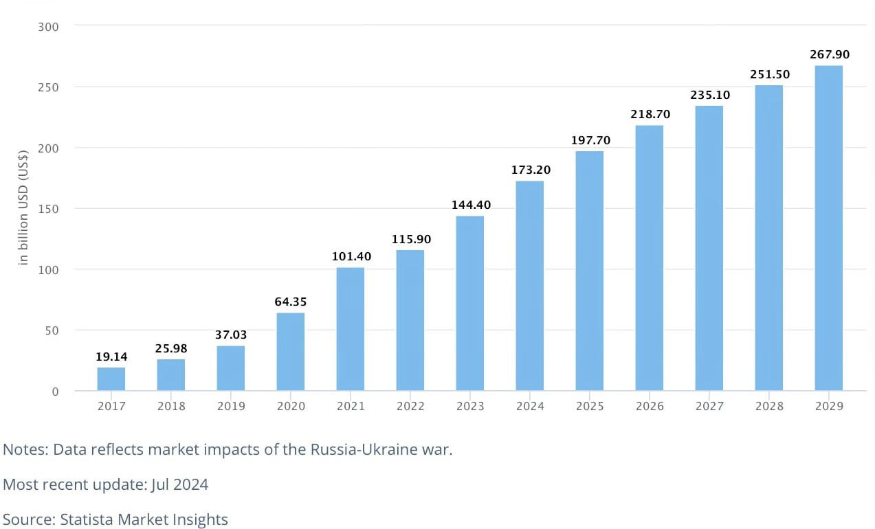 Ingresos globales proyectados para 2024: Se anticipa que el mercado global alcanzará los $173,20 mil millones de ingresos en 2024.